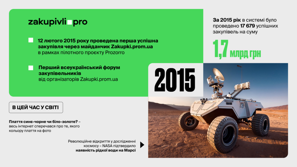 У лютому в результаті громадської ініціативи, що зародилася під час Революції гідності, відбувся пілотний запуск системи Prozorro. І перша закупівля була проведена через майданчик Zakupki.prom.ua.