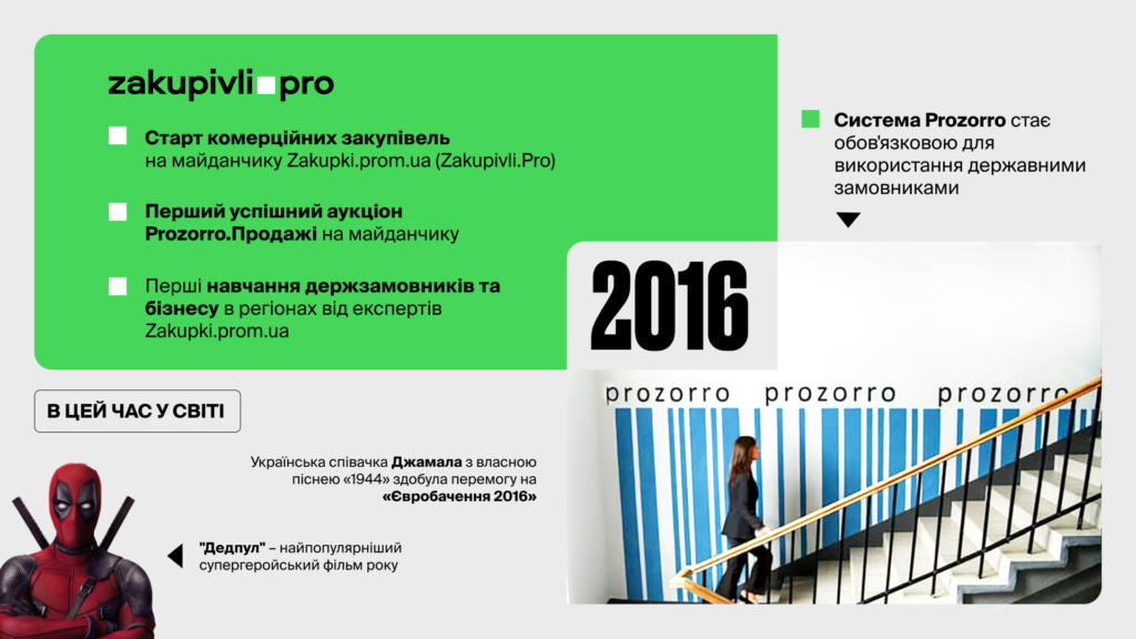 Цього ж року були успішно запущено проведення комерційних закупівель на майданчику Zakupki.prom.ua (Zakupivli.Pro). І вже 17 листопада 2016 року було проведено перший успішний аукціон Prozorro.Продажі з нашого майданчика.