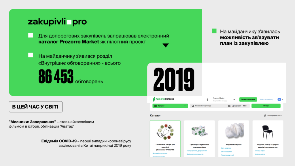 Квітень – Prozorro Market розпочав роботу у пілотному режимі для допорогових закупівель. Це був перший крок до створення зручного електронного каталогу, що значно спростив процес закупівель для замовників.