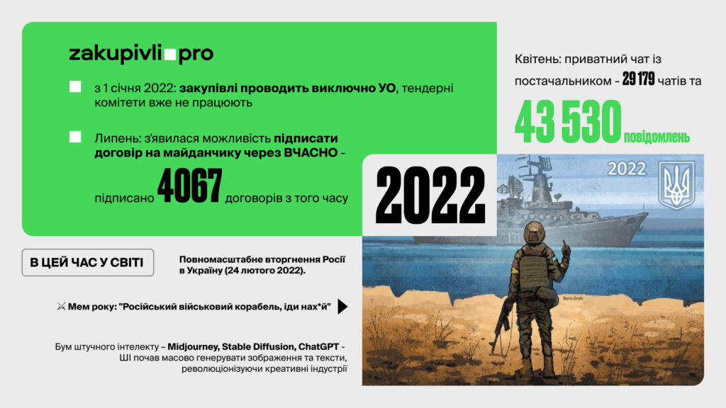 Квітень 2022 – впроваджено приватний чат із постачальником, що значно покращило комунікацію та швидкість обговорення деталей закупівель. Було розпочато 29 179 чатів і надіслано 43 530 повідомлень – це підтверджує, наскільки цей інструмент став популярний серед користувачів!