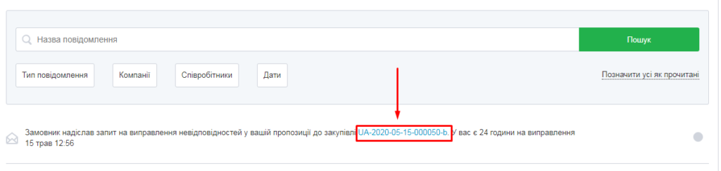 У разі, якщо держзамовник виявив помилку у вашій тендерній пропозиції та надіслав вам запит, ви отримуєте повідомлення у відповідному розділі.