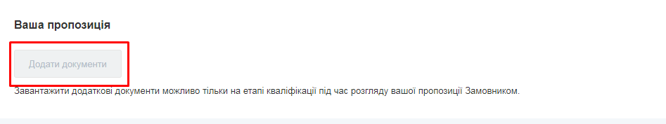 4. На сторінці закупівлі у блоці “Ваша пропозиція” натисніть кнопку “Додати документи” та завантажте документ з виправленою помилкою.
