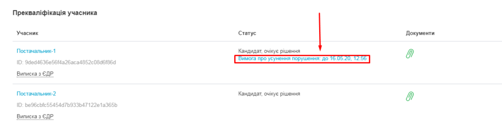 2. На сторінці закупівлі у блоці “Кваліфікація учасників” (чи “Прекваліфікація учасників”) натисніть на вимогу про усунення порушення, щоб ознайомитися, у чому саме полягає помилка.