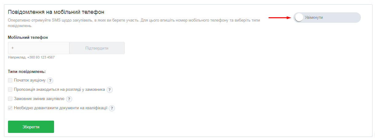 2. Прокрутіть трохи нижче та знайдіть “Повідомлення на мобільний телефон”. Натисніть “Увімкнути”.
