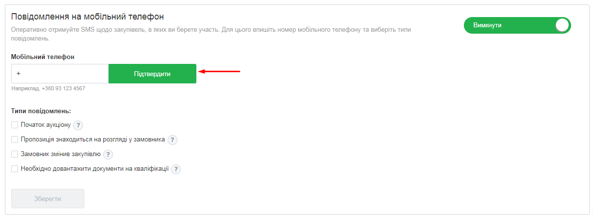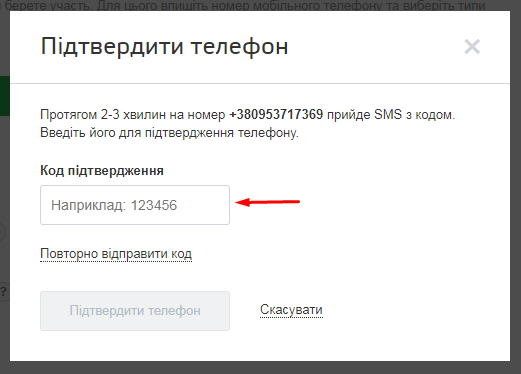 Протягом 2-3 хвилин на вказаний номер прийде SMS з кодом. Введіть код та натисніть “Підтвердити телефон”.