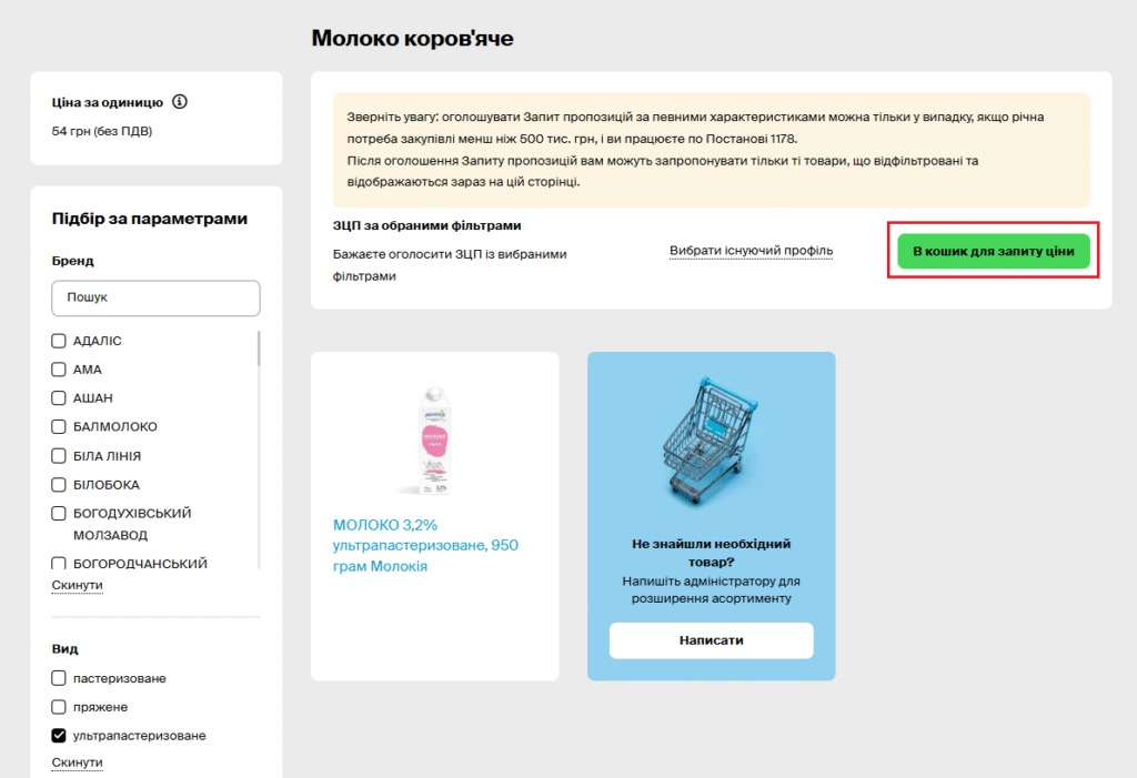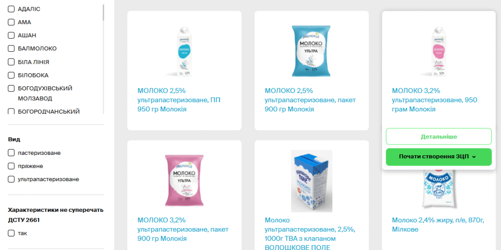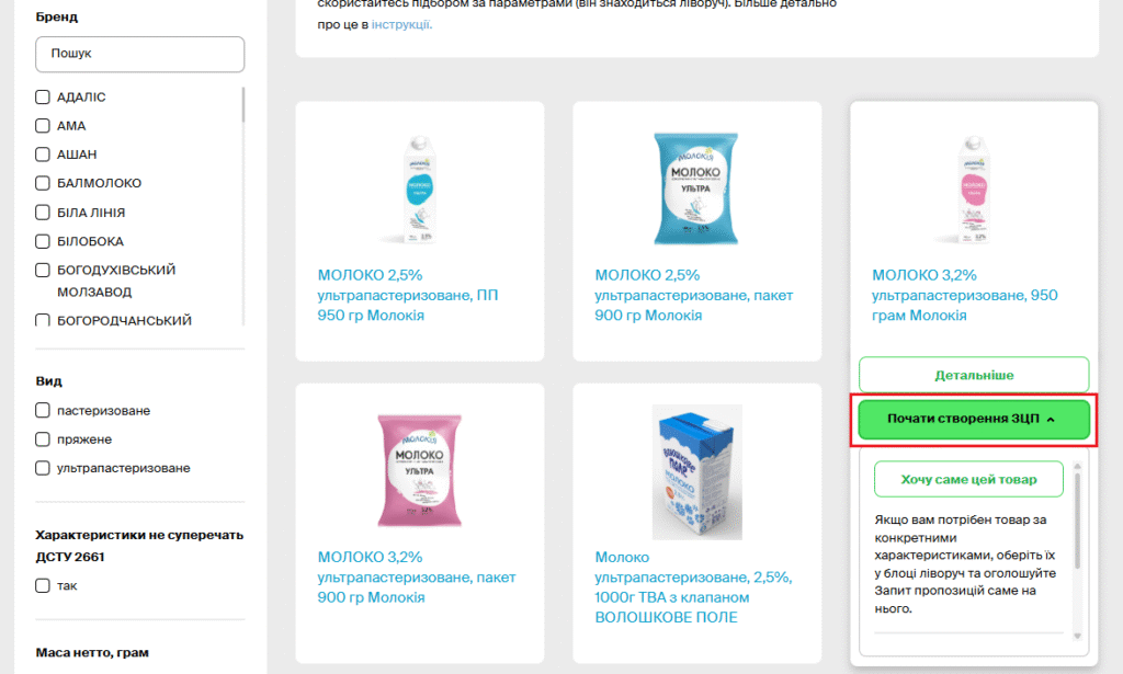 Натомість натискання кнопки “Почати створення ЗЦП” та вибір опції “Хочу саме цей товар” дозволяє замовнику одразу перейти до формування закупівлі з конкретним товаром. Тобто це той самий профіль із налаштуванням характеристик, тільки система автоматично відмітила всі потрібні параметри замість замовника.
