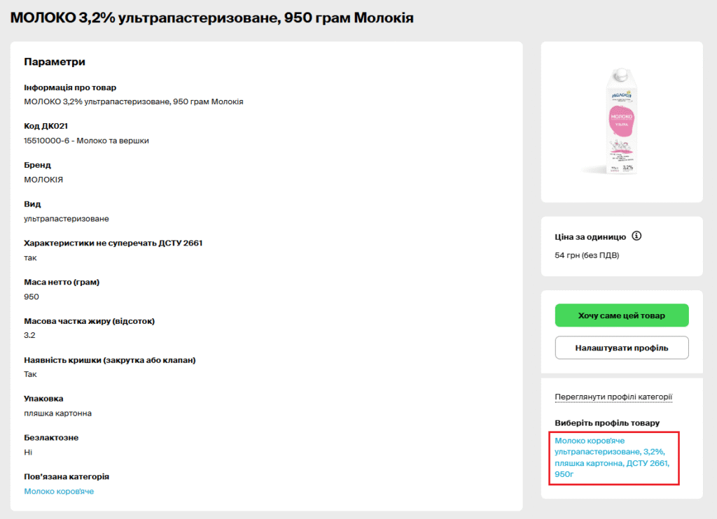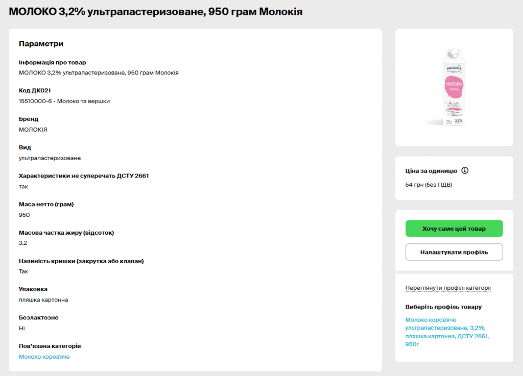 Також, тут відображається профіль який визначений адміністратором, до якого відноситься даний товар. Важливо зазначити, що в Prozorro Market ми закуповуємо не конкретний товар, а певний набір характеристик (профілі товарів).
