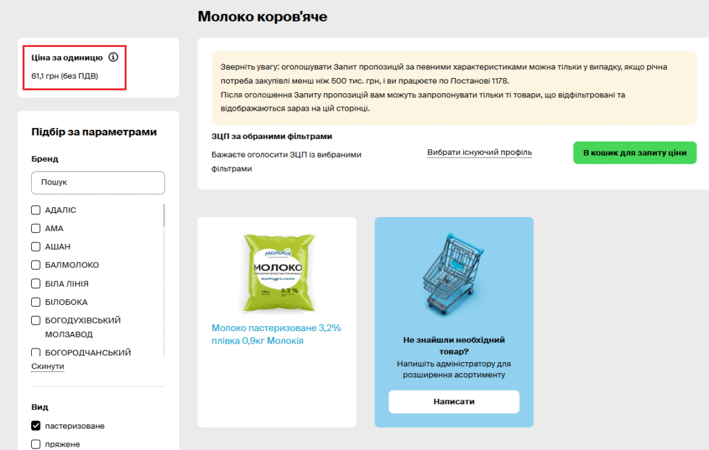 Починаючи з 5 вересня 2025 року, на майданчику відображається середня ціна за одиницю товару. Дані відображаються без урахування ПДВ та розраховані на основі інформації за останній місяць (наприклад 3 15 серпня по 15 вересня), за якою постачальники подавали свої пропозиції.