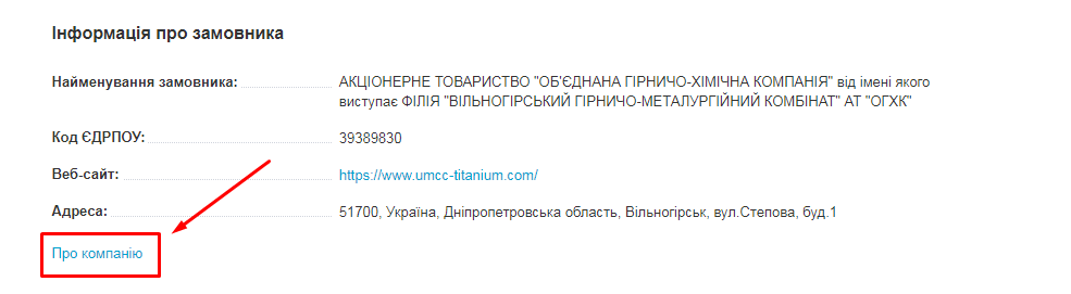 Перейдіть на сторінку державного замовника на майданчику Zakupivli.Pro. Для цього натисніть на сторінці закупівлі “Про компанію”.