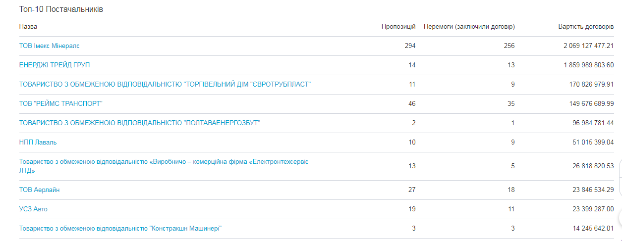 Прокрутіть трохи ниже. Ви побачите розділ “Топ-10 постачальників”. Це перелік компаній, які більше всіх уклали договорів з державним замовником. Цілком ймовірно, що вони візьмуть участь в новій закупівлі. Тобто потенційно це ваші конкуренти.