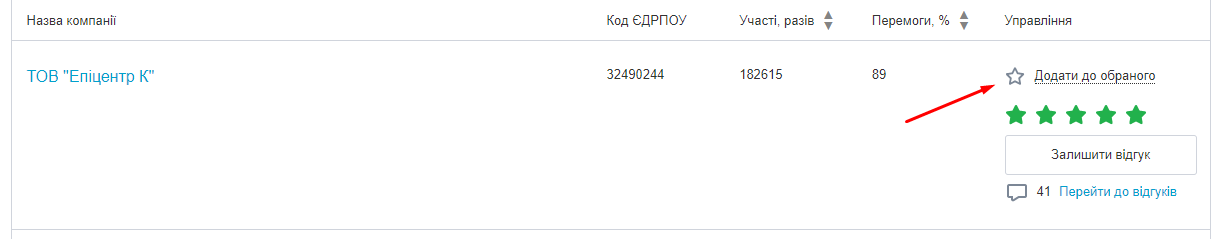 У розділі “Аналіз постачальників” введіть в строку пошуку назву компанії або її ЄДРПОУ. В результатах пошуку навпроти назви компанії натисніть “Додати до обраного”.