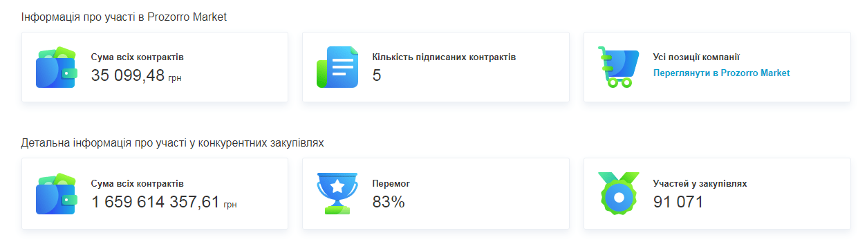 Також ви можете швидко подивитися загальні цифри щодо участі компанії у закупівлях та продажів в електронному каталозі Prozorro Market.