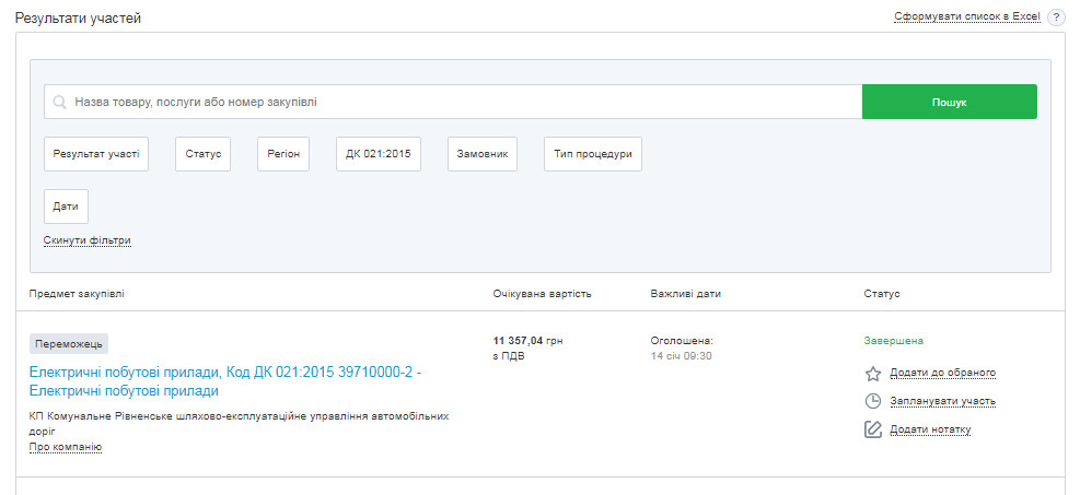 За допомогою фільтрів виберіть закупівлі з аналогічним предметом закупівлі, у яких компанія перемогла.