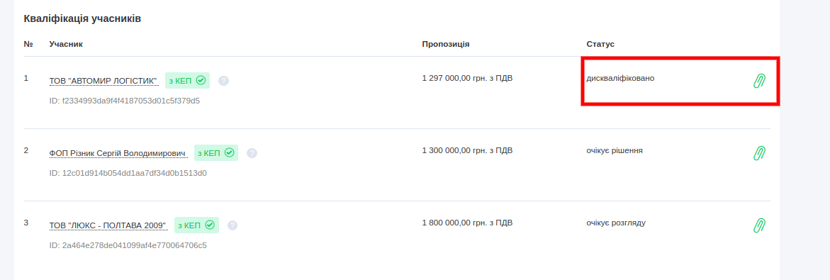 Потім відфільтруйте закупівлі, у яких ваш потенційний конкурент був дискваліфікований. На сторінці закупівлі у блоці “Кваліфікація учасників” натисніть на позначку скріпки, щоб дізнатися більш детально про причини дискваліфікації. Ця інформація дозволить вам запобігти аналогічних помилок.