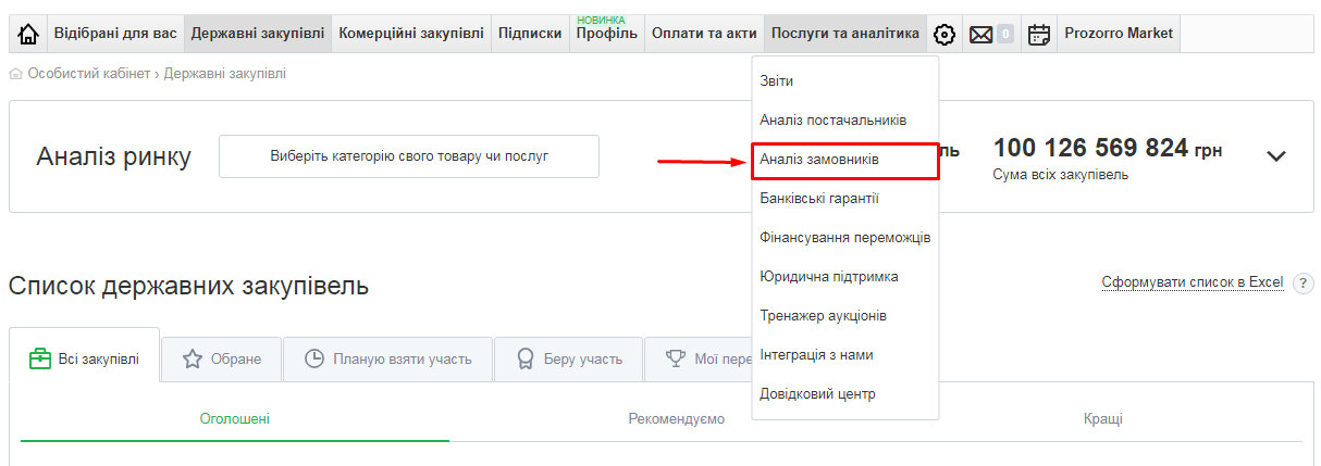 Дізнатися про замовника на нашому майданчику дуже просто. Адже в особистому кабінеті постачальника є підрозділ “Аналіз замовників”.