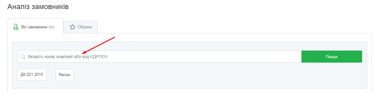 Спочатку виберіть замовника, якого ви збираєтеся проаналізувати. Для цього введіть назву компанії або код ЄДРПОУ у пошуковому рядку.