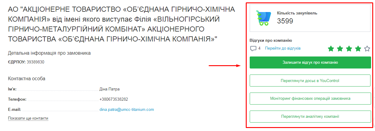 Переглянути аналітику компанії – містить велику кількість даних щодо закупівель замовника: скільки оголошено, скільки успішно проведено, скільки скарг отримано та ін.