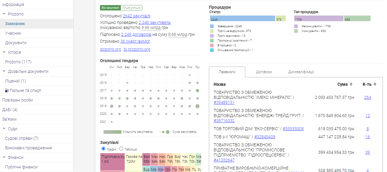 - аналіз замовників з інформацією по їх транзакціям та опублікованим закупівлям;