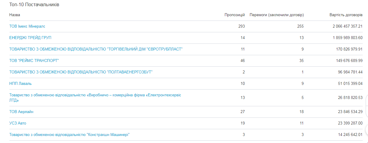 На сторінці замовника ви можете дізнатися Топ-10 постачальників за сумою укладених договорів, а також: