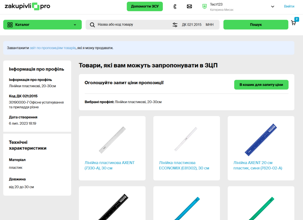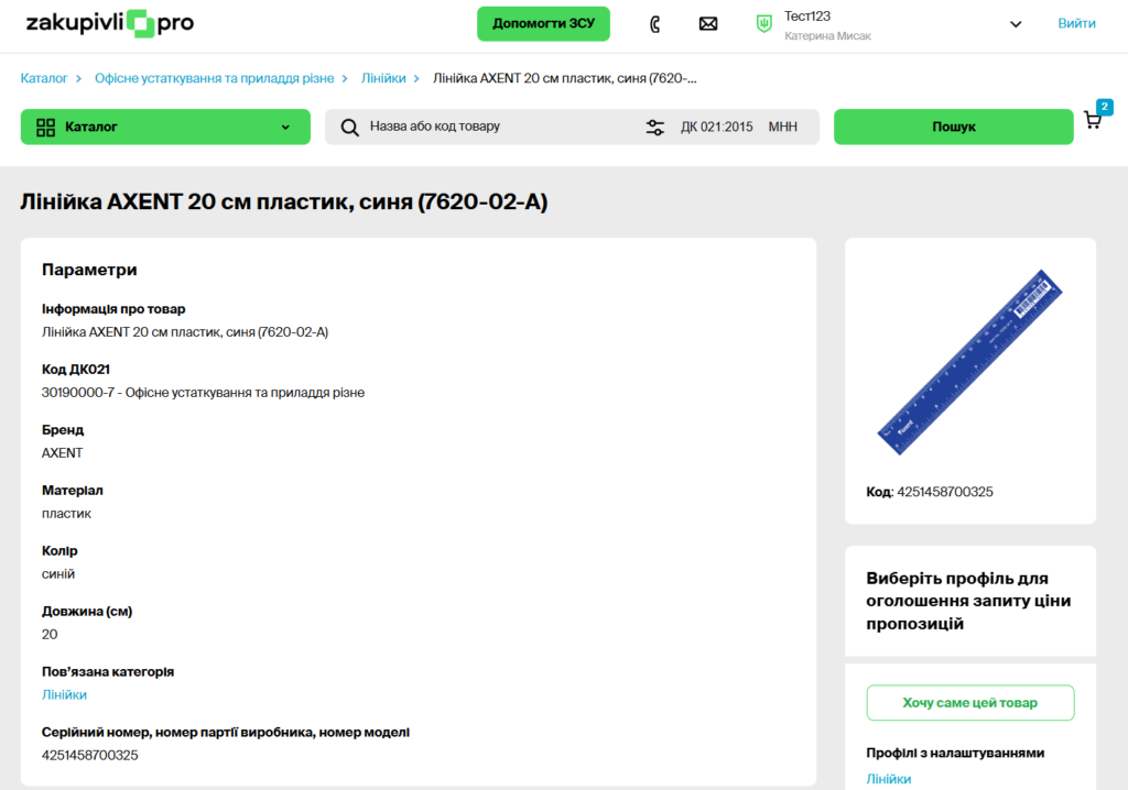 Розглянемо приклад: замовнику необхідно закупити канцелярські лінійки в межах профілю із визначеними характеристиками адміністратором системи.
