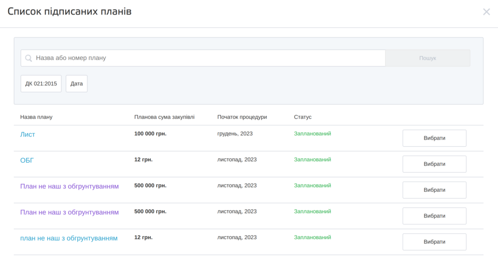 При натисканні кнопки в списку планів будуть з’являтися ті, що підходять по типу процедури, підписані КЕП та знаходяться в статусі “Запланований”.