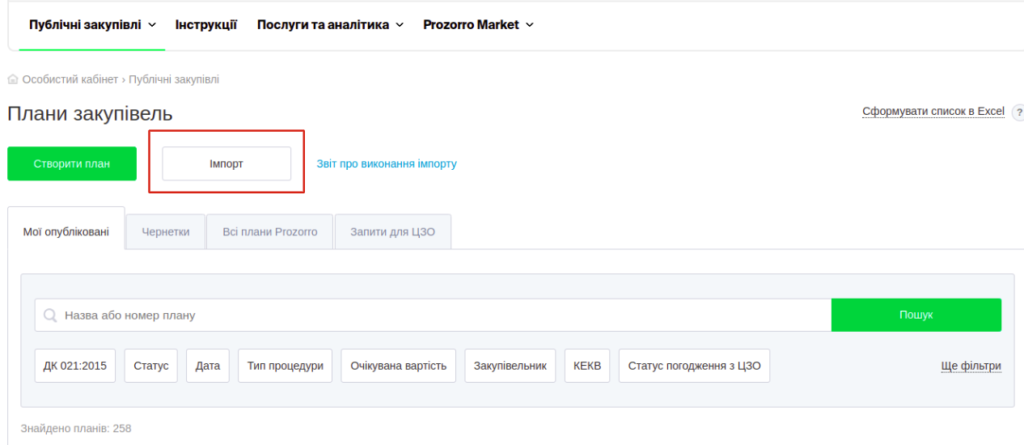 При переході в “Мої плани закупівель” скористайтеся кнопкою “Імпорт”.