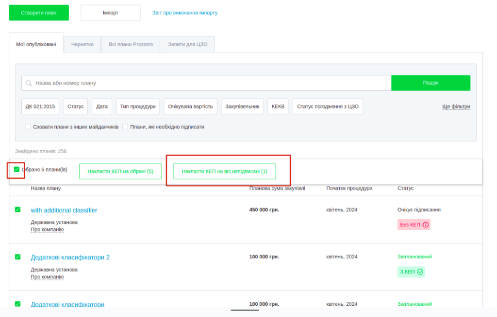 Цей варіант підписання планів значно зекономить ваш час і КЕП необхідно буде накласти лише один раз, замість десяти (якщо, наприклад, публікується одразу 10 рядків плану).