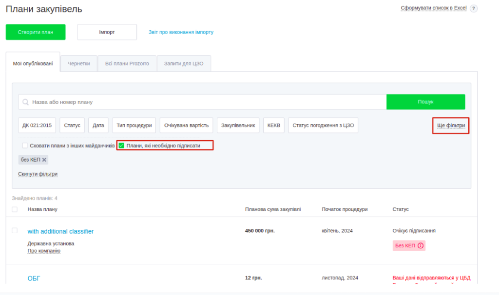 Варіант другий підходить для пошуку непідписаних планів, це використання фільтрів. Для цього натисніть “Ще фільтри” під кнопкою пошуку та виберіть “Плани, які необхідно підписати”. Ввімкніть прапорці біля планів та підпишіть їх.