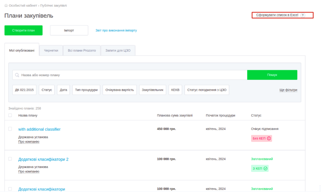 За допомогою фільтрів ви можете зробити вибірку опублікованих в системі планів. А щоб вивантажити цю вибірку варто натиснути “Сформувати список в Excel”.