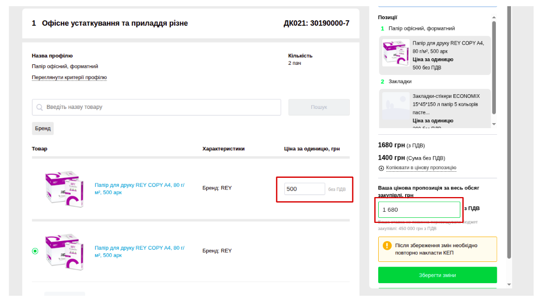 Розглянемо приклад зі скріна. Замовник оголосив закупівлю, яка містить 2 номенклатурні позиції папір та закладки. Учасник обрав необхідний товар та вказав ціну за одиницю без ПДВ до кожної номенклатурної позиції. Система прорахує постачальнику загальну суму без ПДВ та з урахуванням 20% ПДВ (у якості підказки). І постачальник вносить вже остаточну пропозицію у відповідне поле. Платник ПДВ зазначає остаточну пропозицію з урахуванням ПДВ, а ФОП ПДВ не враховує.