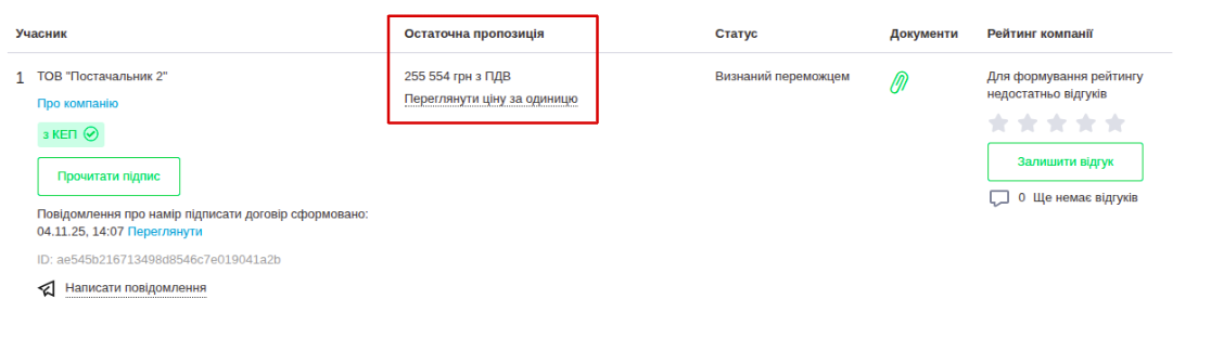 При розгляді пропозиції учасника замовник бачить наступну інформацію про учасника та суму пропозиції.