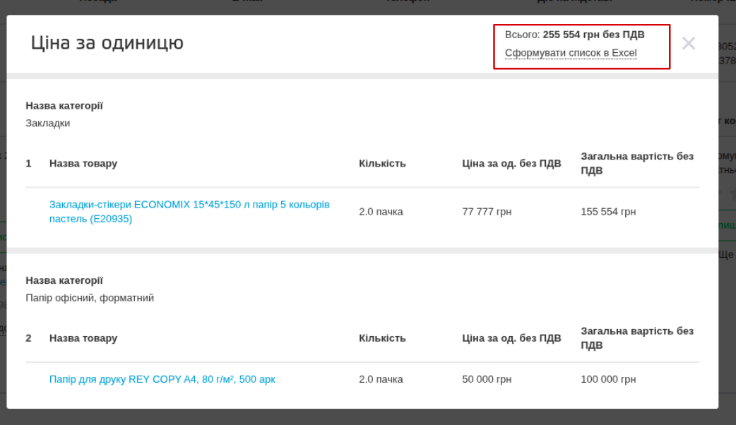 При натисканні на пункт “Переглянути ціну за одиницю” відображається ціна за одиницю без ПДВ по кожній позиції та загальна ціна без ПДВ.