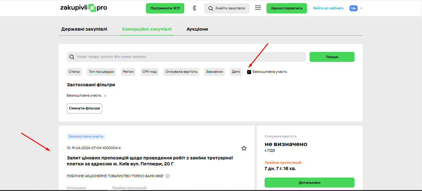 У ряді випадків участь в комерційному тендері для постачальників взагалі безкоштовна. На майданчику Zakupivli.Pro в розділі “Комерційні закупівлі” ви можете поставити галочку “Безкоштовна участь”, і відразу побачити список відповідних тендерів.