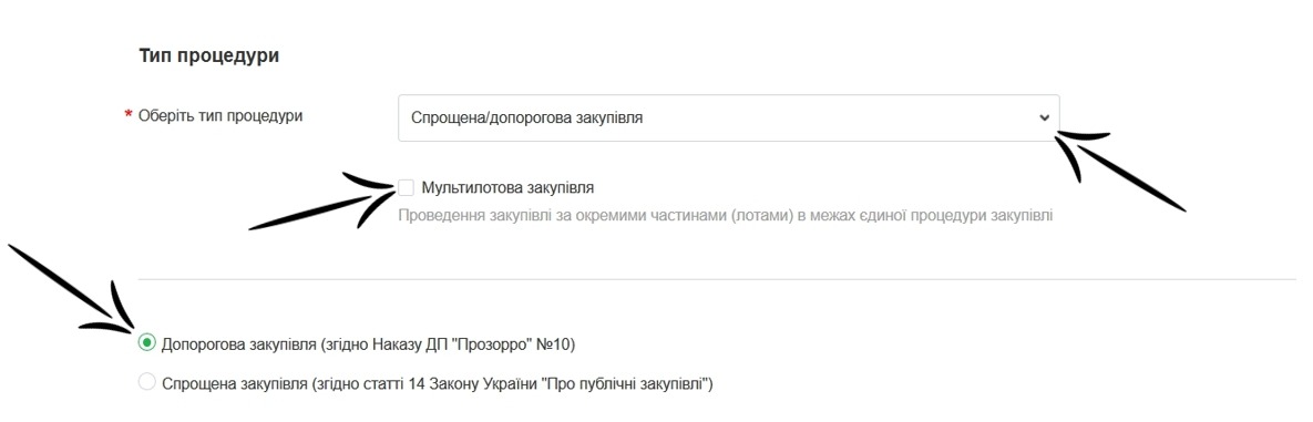 Виберіть тип процедури «Спрощена/допорогова закупівля».