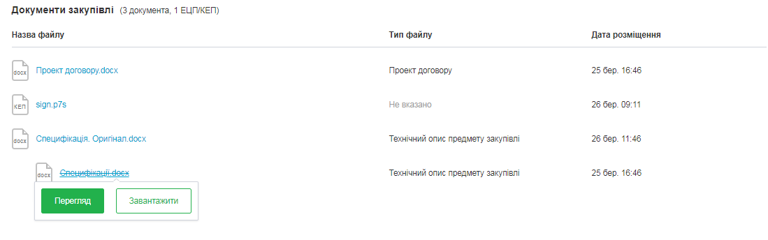 Відкриється список документів, які можна завантажити. Після ретельної перевірки наданих документів, замовнику необхідно прийняти рішення стосовно визначення переможця закупівлі.