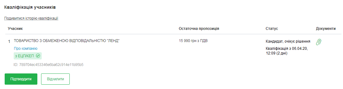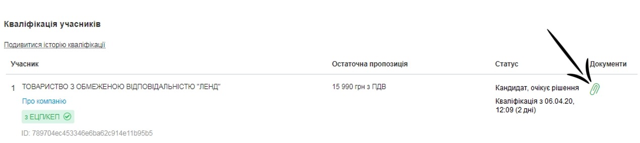 Для того щоб розпочати кваліфікацію, необхідно перейти до блоку «Кваліфікація учасників», де перед вами з’явиться список учасників, які брали участь в аукціоні. Очолюватиме його учасник з найнижчою ціною. Для ознайомлення з документами, що були подані разом із ціновою пропозицією необхідно натиснути на скріпку.