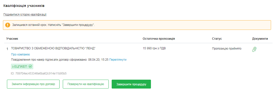 По завершенню третього – фінального раунду відбувається оголошення результатів. Після цього відкривається список з інформацією про кінцеві ставки, а також назви компаній-учасників. Система буде рекомендувати визнати переможцем учасника з найбільш економічно вигідною пропозицією. Всі інші учасники відображаються в порядку зростання ціни. Далі закупівля переходить на етап кваліфікації.