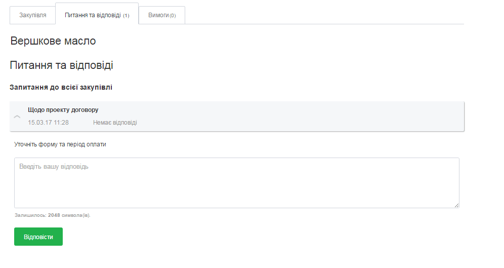 Усі запитання/вимоги/відповіді зберігаються в системі та є доступними всім користувачам для перегляду незалежно від статусу закупівлі. У розділі «Питання та відповіді» публікуються запитання, які поставлені з метою деталізації інформації для формування пропозиції. У розділі «Вимоги» публікуються вимоги, що стосуються умов оголошеної закупівлі в системі, зокрема, усунення порушень.