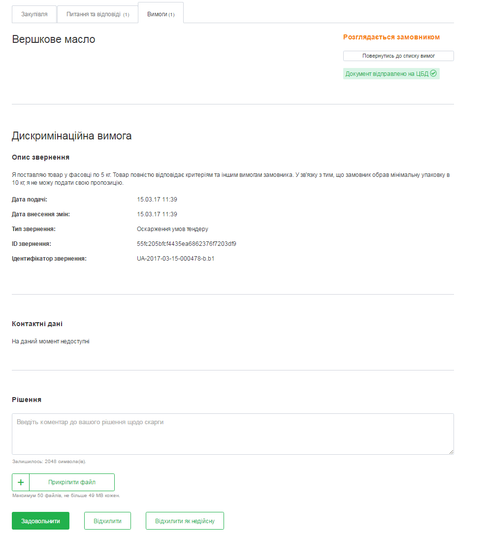 • «Задовольнити» – якщо замовник приймає рішення, щодо задоволення вимоги