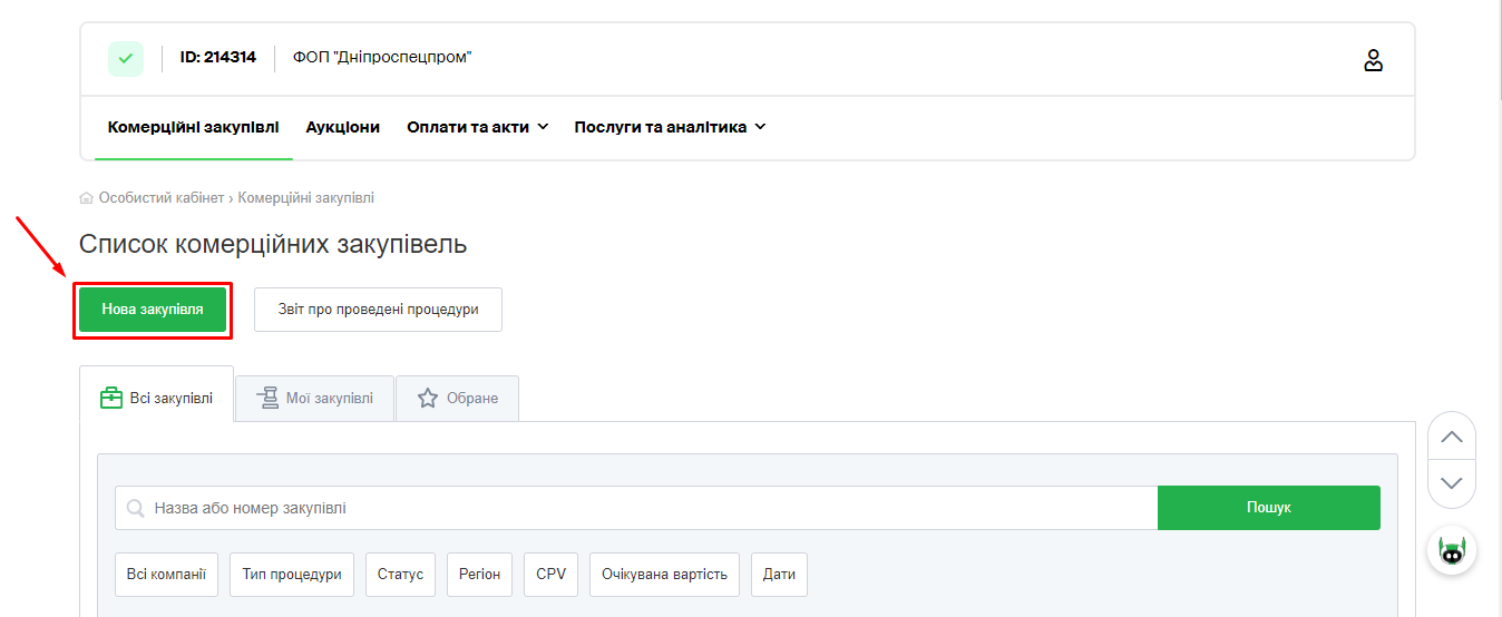 Оголосити процедуру відкритих торгів можна в розділі «Комерційні закупівлі»-«Всі закупівлі компанії», натиснувши на кнопку «Нова закупівля».