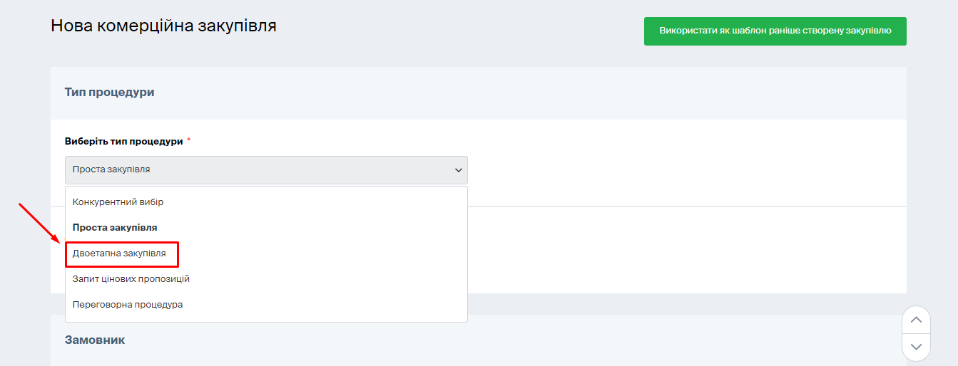 Обираємо тип процедури «Двоетапна закупівля».