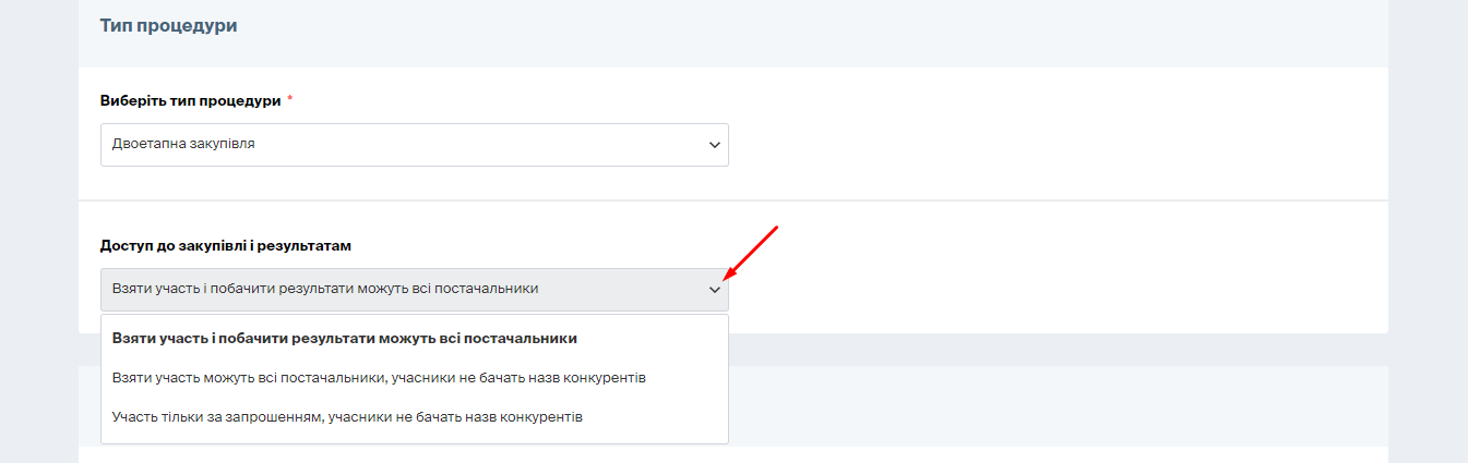 Виберіть один із трьох типів доступів до закупівлі та результатів: