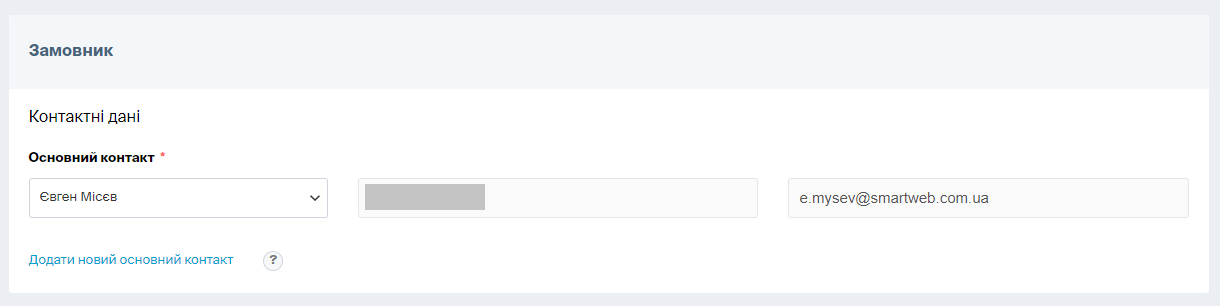 У блоці «Контактні дані» оберіть співробітника, відповідального за проведення процедури в системі. Якщо в особистому кабінеті зареєстровано лише одного користувача, його автоматично буде обрано системою.
