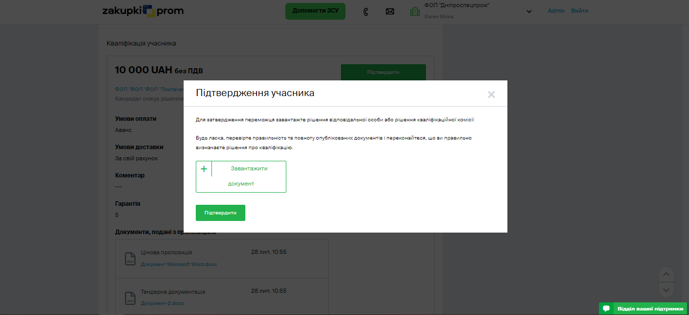Для підтвердження учасника, потрібно натиснути на кнопку «Підтвердити» та прикріпити протокол розгляду.