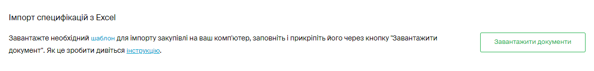 • За бажанням ви можете імпортувати дані про закупівлю з Excel-файлу. Це зекономить час, коли, наприклад, у закупівлі багато позицій. Більш детально про це можна  дізнатися за посиланням.