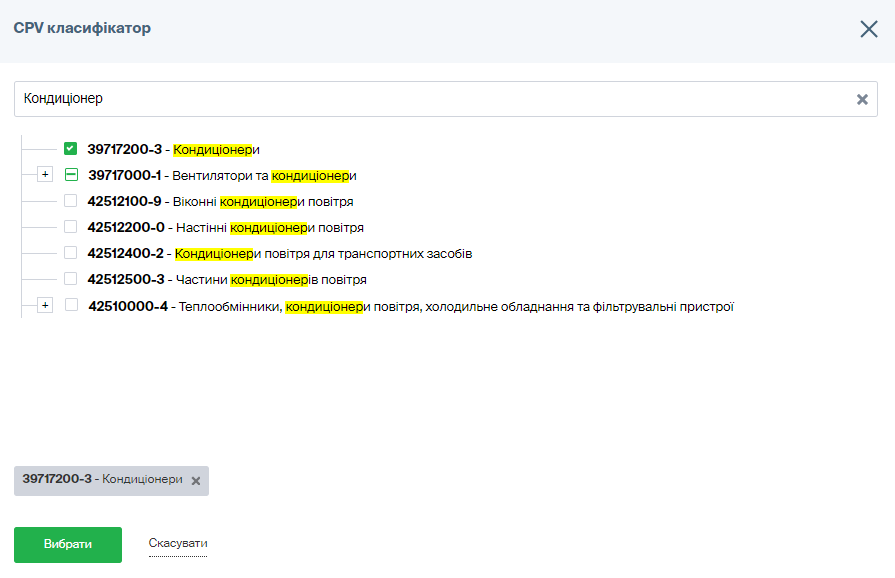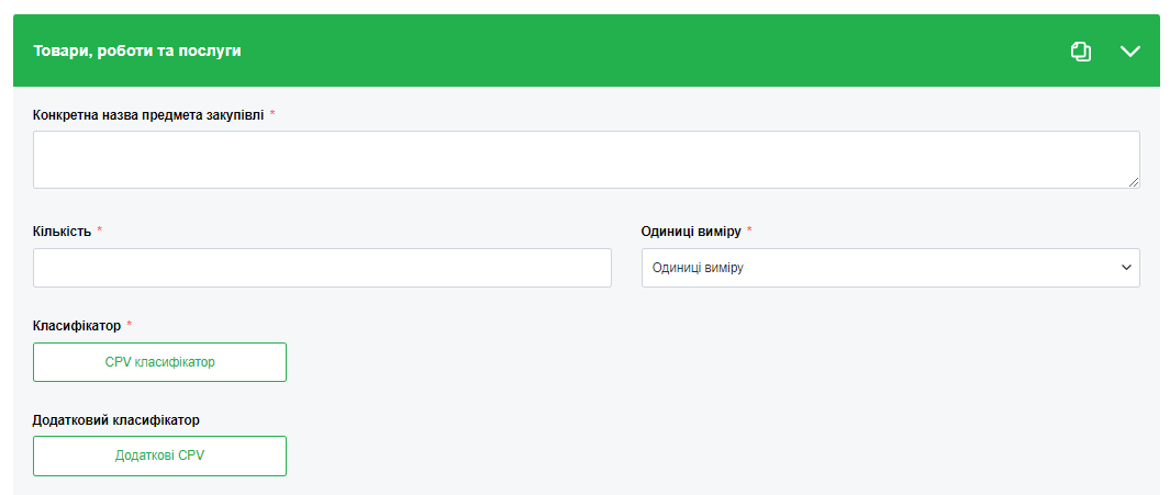 • оберіть код класифікатора CPV, який відповідає предмету закупівлі. Якщо код класифікатора предмета закупівлі буде вказано невірно, постачальники можуть не знайти таку закупівлю