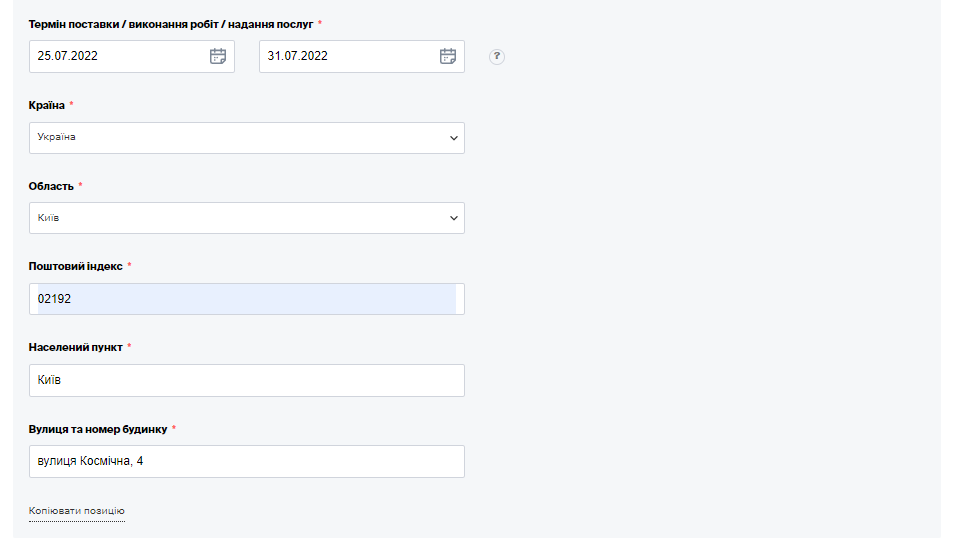 • визначте період поставки товару, надання послуг чи виконання робіт. Поле для вибору початкового строку поставки не є обов’язковим. У разі невідомої дати поставки товару, надання послуг чи виконання робіт зазначте тільки кінцевий строк;