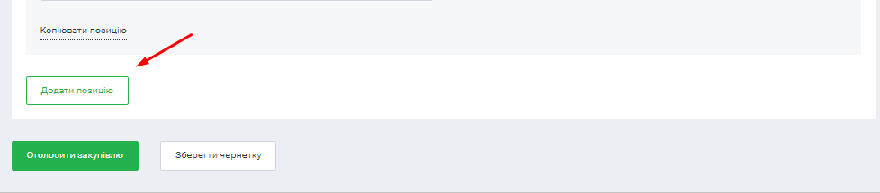 Можна окремо зазначити інформацію про товарні позиції, якщо умовами закупівлі їх передбачено декілька. Для цього необхідно натиснути на кнопку Додати позицію і заповнити інформацію по кожному окремому товару, послузі, роботі, при цьому код класифікатора має бути із однієї групи і співпадати за 4 цифрою CPV.