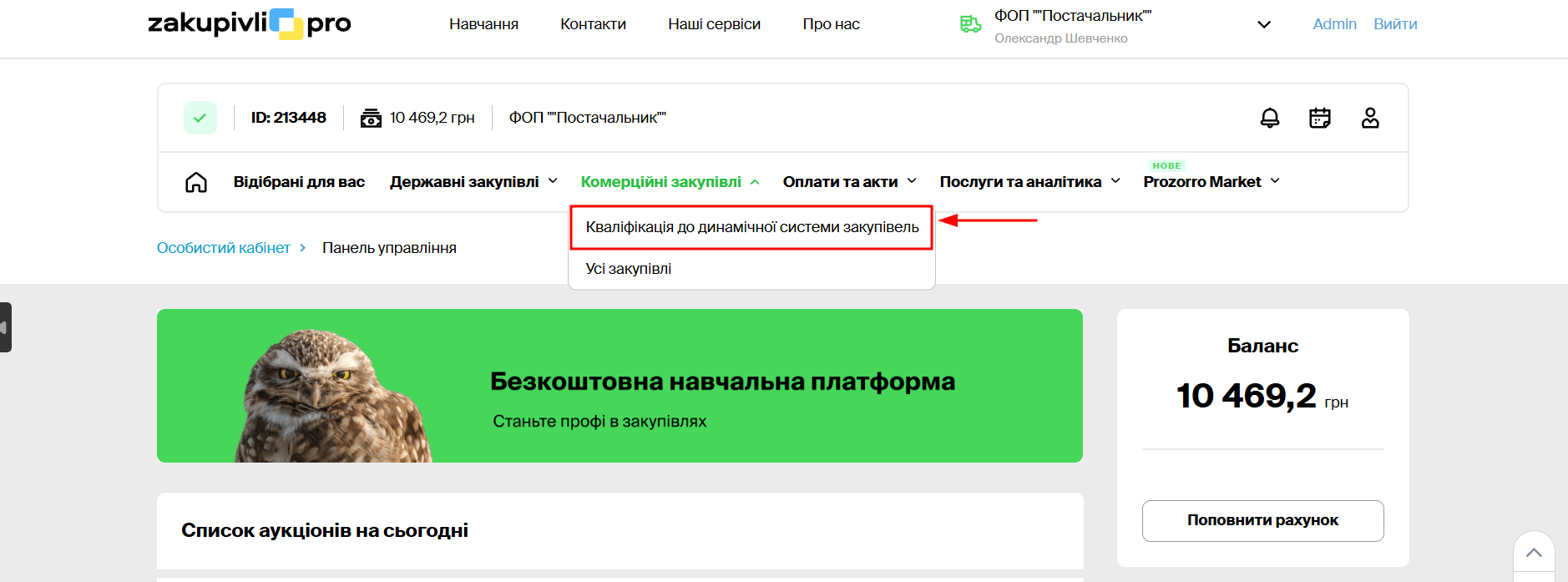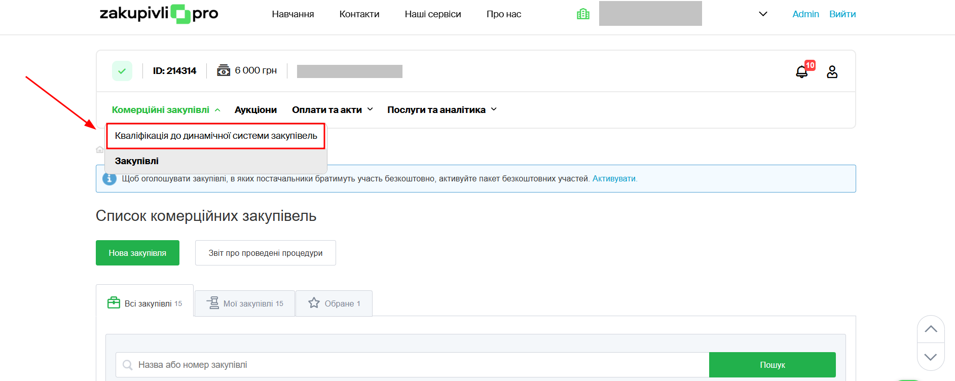 1. Перейдіть в особистому кабінеті комерційного замовника в меню Комерційні закупівлі – Кваліфікація до динамічної системи закупівель.