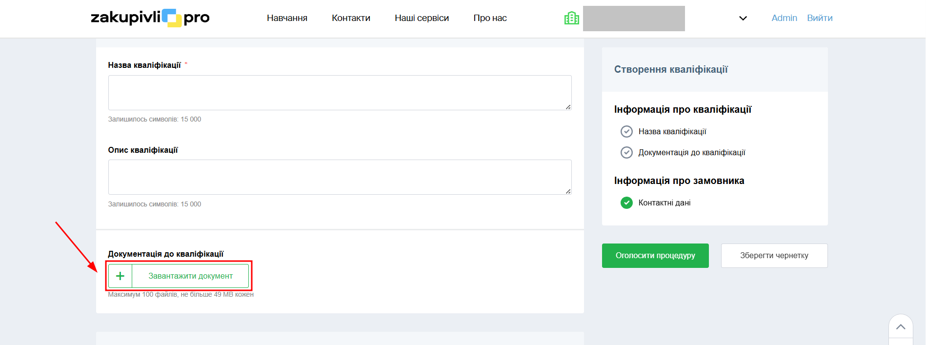 4. Завантажте документи до кваліфікації. В документах ви можете описати критерії, по яких ви будете кваліфікувати постачальників. Прозорі та зрозумілі критерії – це основа побудови довіри постачальників та ефективних ділових взаємовідносин на ринку закупівель.